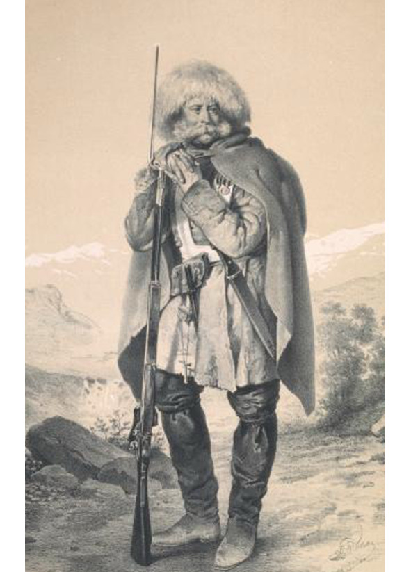 В. Ф. Тимм. Солдат Отдельного Кавказского корпуса во время зимнего похода в Дагестан. Литография XIX в.
