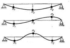 Бабаков [4,с.124] для балки с 3 точечными нагрузками приводит три возможные формы колебаний: