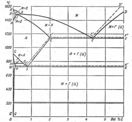 На диаграмме линии стабильного равновесия C’D’, E’C’, S’E’, P’S’K’, P’Q’. Устойчивые растворы углерода в железе выше линии ABC’D’. Линия AHN ограничивает однофазную область твердого раствора углерода в α-, γ-, δ-железе. Линия NIE’SG соответствует твердому γ-раствору, линия GP’Q’ соответствует твердому α-раствору. Оставшиеся области на диаграмме соответствуют двухфазным сплавам. ABH – жидкий сплав и δ-феррит (твердый раствор), HJN – γ-аустенит и δ-феррит (твердые растворы), JBCE – жидкий сплав и γ-твердый раствор (аустенит), DCF – жидкий сплав и цементит, ECFKS – аустенит (γ-твердый раствор) и цементит, GSP – феррит и аустенит (α- и γ-твердые растворы), QPSK – феррит (α-твердый раствор) и цементит. На линии HJB для перекритической температуры три фазы – жидкость, δ-феррит, аустенит. На линии E’C’F’ для эвтектической температуры в стабильном равновесном состоянии фазы жидкости, аустенита, графита, в метастабильном состоянии по линии ECF фазы жидкости, аустенита и цементита. На линии PSK при эвтектоидной температуре (метастабильное равновесие) фазы состоят из аустенита, феррита и цементита, на линии P’S’K’ при эвтектоидной температуре (стабильное равновесие) фазы состоят из аустенита, феррита, графита. На диаграмме магнитному превращению феррита и цементита соответствуют горизонтальные линии при 768 и 210°С. Феррит имеет ферримагнитные свойства ниже 768°С, выше феррит парамагнитен. Цементит свыше 210°С (точка Кюри) переходит в парамагнитное состояние из ферримагнитного состояния.