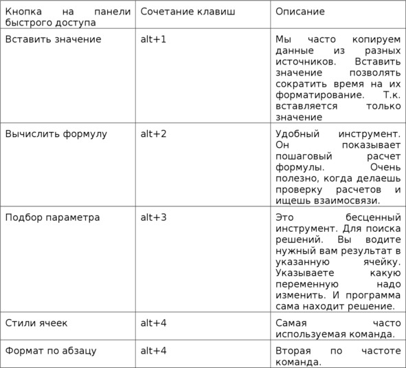 Панель быстрого доступа позволяет вам использовать сочетания клавиш Alt + цифры от 1 до 0. Вы можете запрограммировать 10 команд-кнопок, которые всегда будут под рукой. Ниже я приведу пять моих горячих клавиш. Почему только пять? Все просто: левой рукой я нажимаю на клавиатуре нужную мне комбинацию, а в правой руке я держу мышь и выбираю нужные мне ячейки.