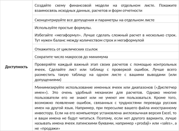 Помните, в большинстве случаев вы создаете финансовую модель для других пользователей. Ваши расчеты наверняка будут проходить проверку или аудит. Поэтому, создавая модель, вы всегда должны помнить о других ее пользователей. Слишком простая модель говорит о слабой проработке проекта, сложная может оттолкнуть потенциальных инвесторов. Не у всех есть время на изучение сложных моделей. Итак, приемы, которыми вы можете пользоваться, чтобы повысить уровень доступности для понимания вашей финансовой модели.