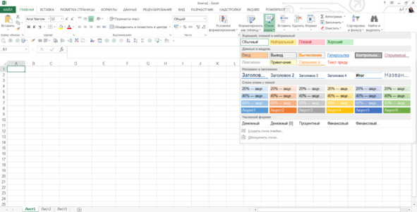 Благо для нас, начиная с версии Excel 2007, появился отличный инструмент «Стили ячеек». Он находится «Ленте» -> «Основные вкладки» -> «Главная».