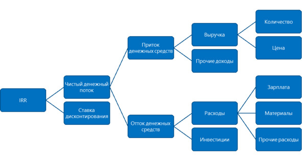 Предположим, вы хотите привлечь инвестиции в свой проект. Вы определись с инвестором или кредитором. Уточнили у него, какие показатели проекта должны быть в финансовой модели и их примерные значения. Допустим, инвестора в первую очередь интересует IRR проекта (внутренняя норма доходности). Зная это, вы раскладываете данный показатель на составляющие и избегаете ненужных расчетов, например, вам уже не надо считать коэффициенты ликвидности или платежеспособности.
