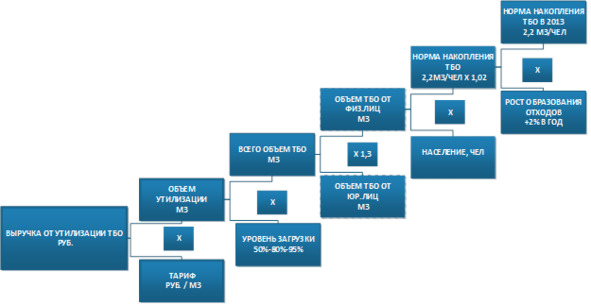Окончательно определиться с составом показателей проекта, с выбором структуры финансовой модели можно с помощью древовидной диаграммы – когда вы идете от конца к началу. От значения ключевых показателей проекта к исходным данным. С каждым шагом вы опускаетесь на новый уровень детализации. Таким образом, вы получаете видение и понимание вашего проекта. Вы начинаете понимать, какие исходные данные вам нужны и как они связаны с ключевыми финансовыми или инвестиционными показателями. Приведу пример такой детализации. На нем показано, как связана выручка оператора полигона твердо-бытовых отходов с численностью населения на территории обслуживания.
