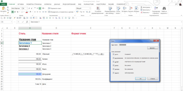 Для наглядности можно сделать так. На отдельном листе создайте стили для всех типов ячеек, которые вы будете использовать в своих расчетах. Слева сделайте нужный вам формат ячеек, а справа напишите наименования формата. Потом выберите отформатированную ячейку и нажмите «Стили ячеек» -> «Создать стиль ячейки…» и окно «Стиль», в графе «Имя стиля» удалите «Стиль 1» и напишете новое имя для этого стиля. Например, «Заголовок 1».
