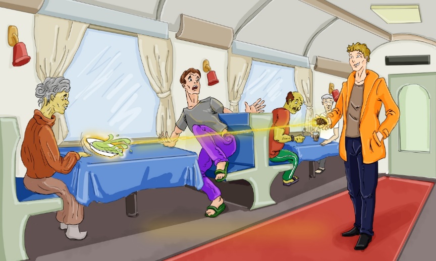 Вагон-ресторан не представлял из себя ничего удивительного: Там стояли обыкновенные диваны со столиками, за которыми сидела большая компания людей и что-то бурно обсуждала.