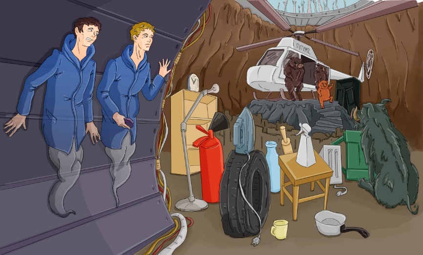 Потолок у комнаты закрылся, и лопасти вертолёта утихли. Двери открылись, и из них показались два больших кабана. По виду они были очень сильные. Выйдя из вертолёта, кабаны встали по бокам от двери. Следом вышли кабан-пилот и огромный шкаф с автоматом. Но внутри находился ещё один предмет, который вышел после всех остальных. Его приветствовала вся компания, собравшаяся около вертолёта.