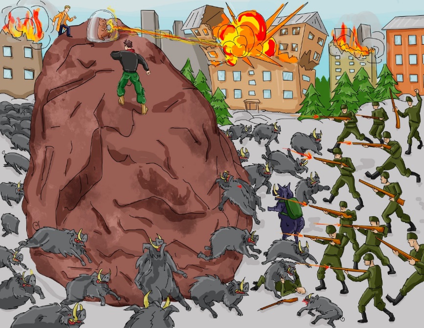 Люди удивились такому повороту событий; им стало не так страшно. Они побежали следом за Иваном, и начали помогать ему, расстреливая вражеских кабанов.