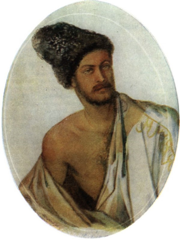 М. Ю. Лермонтов. А. А. СТОЛЫПИН-МОНГО (Столыпин в костюме курда). 1841. Акварель. Литературный музей, Москва. Овал. 13,2×9,4.