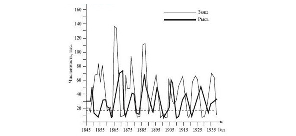 Колебательному процессу подчиняется даже процесс популяции животных в природе, в пример приведу численность Рыси и Зайцев по годам:
