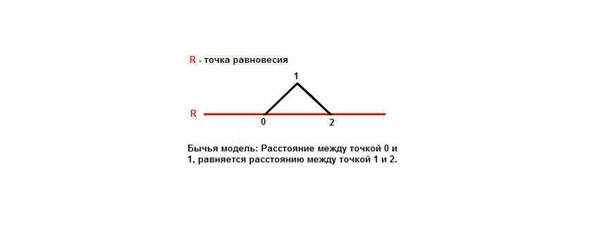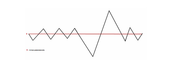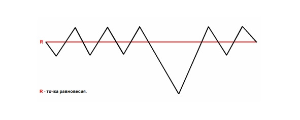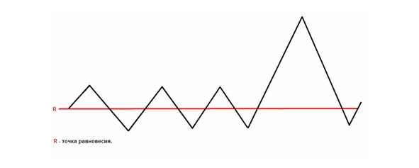 На рынках ценных бумаг эта модель выглядит следующим образом: Между Быками и Медведями, которые в своей ежедневной торговой практике используют только какие-то статистические данные и не учитывают закон вибрации, распределение вероятности получения прибыли и убытков равна примерно 50/50. Уровень в 50/50 это точка равновесия, от которой происходит колебание вероятности то в лучшую сторону, то в худшую по отношению к успешной торговле, с большим склонением к худшей из за сильной конкуренции масс торговцев ценными бумагами между собой.