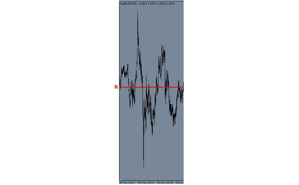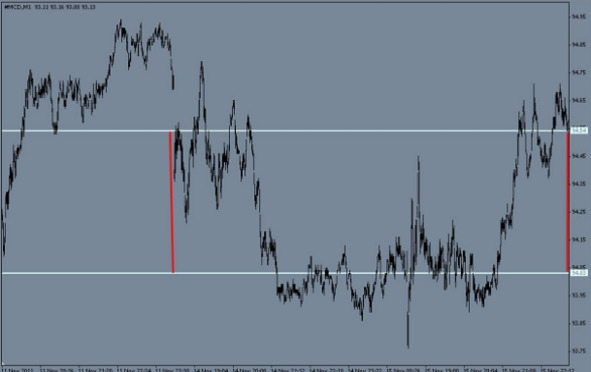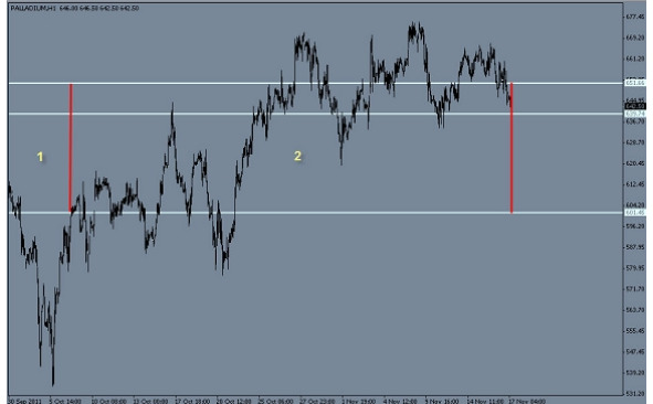 Далее чтобы не учитывать мелкие колебания, я поставил фильтр на минимальное движение. То есть пока курс EUR/USD не выйдет за порог 300 пунктов от точки расчета, эти колебания учитываться не будут. Получилось так, с той точки курс ушел вниз и зашел за порог в 300 пунктов. Я начал следить за ценой в ожидании возврата цены в сторону начальной точки расчета, на 50% от максимального удаления от начальной точки.