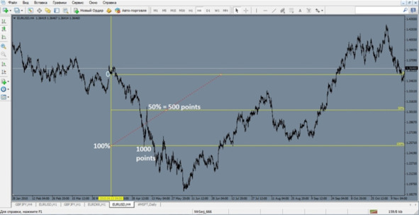 Метод исследования был таков, по закону вибрации, где бы мы не вошли в рынок, с этого момента куда бы не пошел курс ценной бумаги, он в последствии вернется обратно и отработает свои 50%.