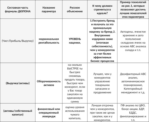 Так вот вся эта схема работает как раз на то, чтобы на каждом своем этапе хотя бы на пару-тройку процентов улучшить работу компании – где-то поднять оборачиваемость одного магазина, где-то наценку на другой товара, где-то получить пару дней лишней отсрочки на эту категорию товара т. п. И эти иногда незаметные пары процентов, по мере продвижения к конечному этапу накапливаются, сливаются, помогают друг другу, и как ИТОГ, иногда дают десятки, а то и почти РАЗЫ повышения прибыльности.