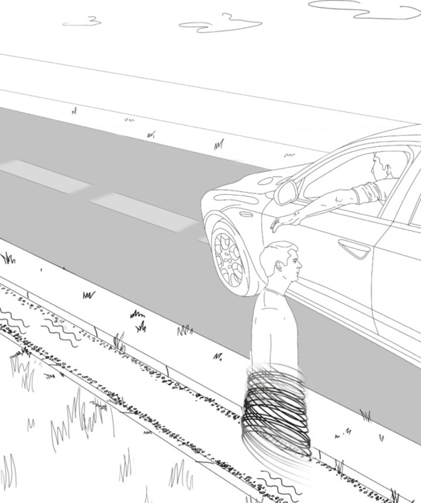 4. Динамическое вытягивание – это очень удобная техника, которая позволяет использовать энергию реального движения (к примеру, в вашем автомобиле) или медитативного (то есть движения, которое вы себе представляете). Для этого надо вообразить туловище пациента без нижней части (то есть по пояс и без ног), если вы вытягиваете негативную энергию из тела. Представьте, что вы держите его нижней частью к земле (или воде) и вместе с тем видите, как из этой части в землю (или воду) втягивается негативная энергия в любом удобном для вас виде – клубы дыма, кашеобразная субстанция, камни и т. д. Аналогичным образом можно делать и с отдельным органом. Будет лучше, если вы будете представлять, как держите тело над землей, так как в асфальт негативная энергия втягивается на порядок хуже. Также хорошо негативная энергия втягивается, если в процессе движения автомобиля вы мысленно проводите телом над длинной канавой, каналом с водой и т.д., вообще вдоль любого длинного дорожного сооружения (дорожный бордюр, сливная система и т.д.) (Рисунок 11).