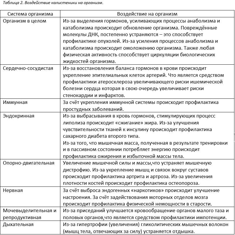 Калистеника – это тренировки развивающие функциональную силу с помощью упражнений в которых в качестве противовеса используется вес тела тренирующегося. В таблице 2 даны сведенья о воздействии анаэробных (силовых) нагрузок, например, калистеники на организм.