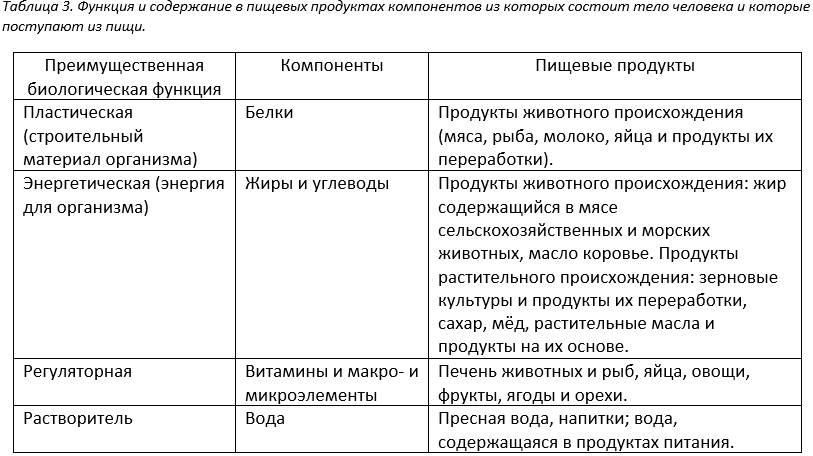 Основная масса химических элементов, из которых построены пищевые вещества, а также тело человека – это водород, углерод, кислород, азот; эти же элементы входят в состав конечных продуктов обмена веществ. А компоненты, из которых состоит тело человека и которые поступают из пищи – это белки, жиры, углеводы, вода, витамины и макро- и микроэлементы. Более подробно смотри таблицу 3.