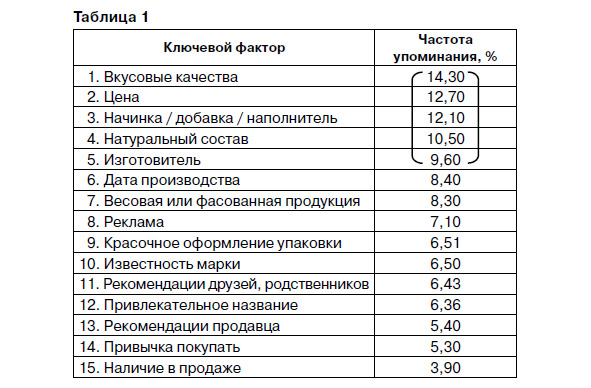 В ходе опроса, проведенного среди покупателей печенья в магазинах, были получены следующие факторы (табл. 1):