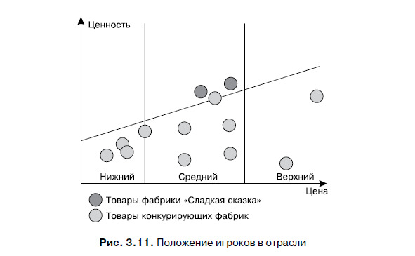 При анализе своего места в отрасли наглядным будет составление диаграммы занимаемых игроками долей рынка. Еще интереснее посмотреть изменение этой диаграммы в динамике (тренд) за последние 3 года: это даст много важной информации к размышлению. В частности, являются ли выделенные ключевые факторы успеха действительно значимыми для рынка (то есть приводящими к успеху на нем) или существуют еще какие-то причины, объясняющие получившийся расклад сил.