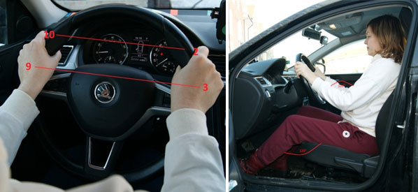 4) Регулировка руля по вылету и высоте, если есть возможность его регулировки. Вытягиваем руль к себе так, чтобы запястье можно было свободно расположить на рулевом колесе, как на циферблате в точке "двенадцать часов"(согласно часового циферблата). Далее регулируем по высоте. Первое – приборная панель видна полностью, второе – не мешает обзору дороги, фиксируем руль. Тогда при положении рук на руле в точке 9/3 или 10/2 (согласно часового циферблата), ваши руки будут лежать на руле, немного согнутыми под углом примерно 120°. В данных точках, момент приложения силы максимальный и реакция рук быстрее и точнее.