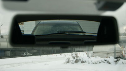 Рамка зеркала повторяет контур стекла заднего вида (то, которое находится за тобой, сзади), слева и справа, могут попадать подголовники передних сидений.