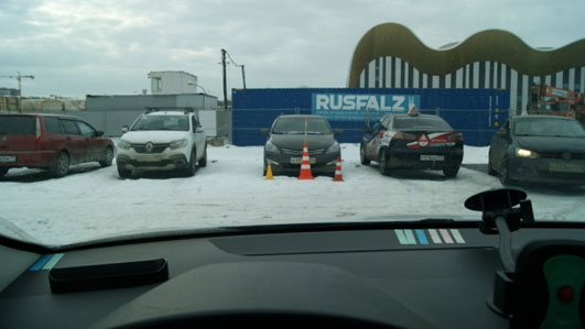 Начинаем двигаться вперёд, до тех пор, пока самый маленький конус скроется из виду, в этой точке надо остановиться. Смотрим на большой конус и примерно запоминаем расстояние, как он смотрится из-за руля, выходим и смотри, какое расстояние в реальности. Так мы тренируем глазомер. Пока маленький конус виден мы можем произвести любой манёвр: объезд, поворот, разворот, перестроение.