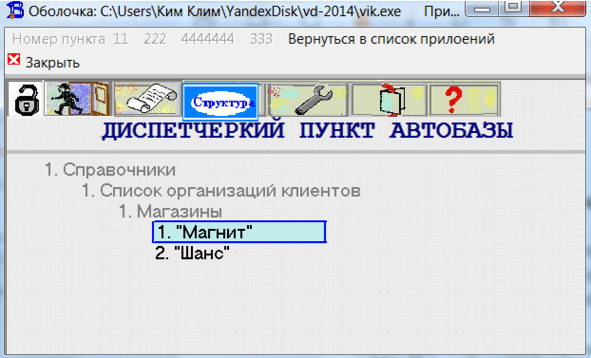 Оболочка – это операционная среда, предназначенная для работы конечных пользователей и программистов. Оболочка постоянно поддерживает на экране информацию об АРМ в форме классического оглавления. В дальнейшем будем называть эту информацию структурой АРМ или просто структурой. Структура больше всего напоминает книжное оглавление. Приведем пример того, что видит диспетчер автобазы на экране своего АРМ.