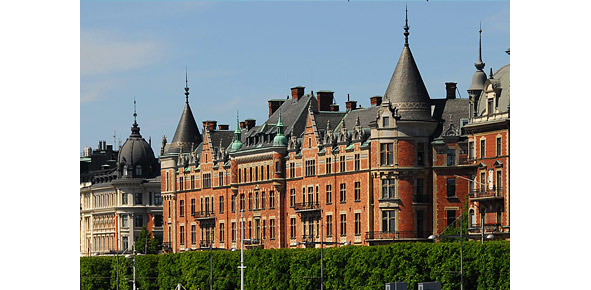 Эффектное сочетание фактур различных материалов – нескольких сортов кирпича и природного камня – стала основой выразительности фасада и в здании на Риддархольмен, принадлежащим компании «Норштедт и сыновья» (арх. М. Исаеус, 1882 – 1889 гг.). Нарядное оформление и высокие крыши позволили постройке органично вписаться в общую композицию старинного городского центра.