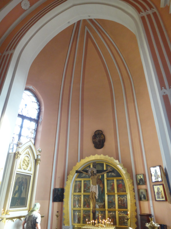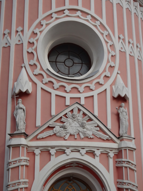 Однако, наружное убранство пробуждало особые ощущения. Ю.М.Фельтен элегантно оформил фасады изящными вертикальными тягами и стрельчатыми арочками. Белоснежной тональности, они мягко контрастировали с выкрашенными в бледно-розовый цвет стенными поверхностями. Зодчий как бы попытался спрятать «классицизм» под ажурной «готической» декорацией. И ему, в самом деле, удалось добиться сногсшибательного эффекта. Тонкие линии фасадных членений выразительно перетекали в возвышающиеся над карнизами башенки-пинакли с высокими пирамидальными кровлями. Над входом в храм было помещено круглое окно, как бы имитирующее «розы» старинных готических церквей. Заострённые игольчатые формы также обрамляли барабаны и делали почти незаметными маленькие гранёные купола – нежно-серого цвета, в целом, созвучного общей колористической гамме постройки.