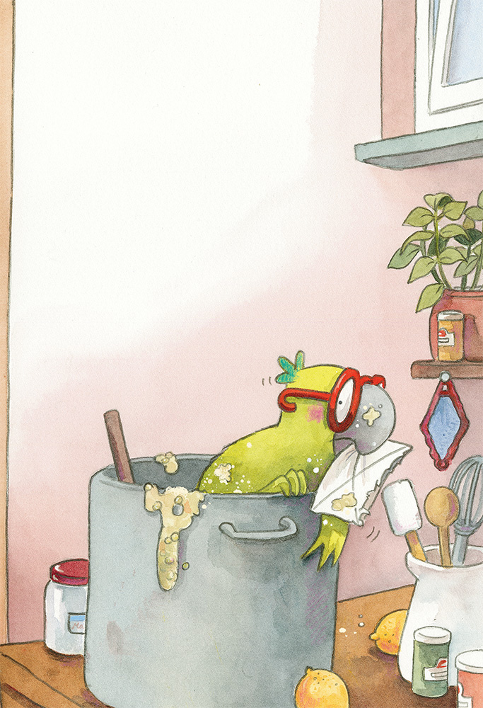 Хорн схватил письмо и полетел на кухню. Там попугай увидел на полу пятна от горохового супа и ужаснулся: быстро всё убрать он не успеет!