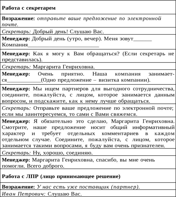 установление позитивного контакта, преодоление секретаря, выход на ЛПР. Задачи: