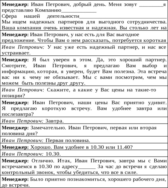 Это образец. Если какие-то слова вам не подходят, замените их на удобные для Вас. Ваша задача – быть доброжелательным и позитивным и помнить о цели звонка. Приемлемая статистика для начинающего: 10 «холодных» звонков – 1 встреча. Эффективное время «холодного» звонка – не более пяти минут.