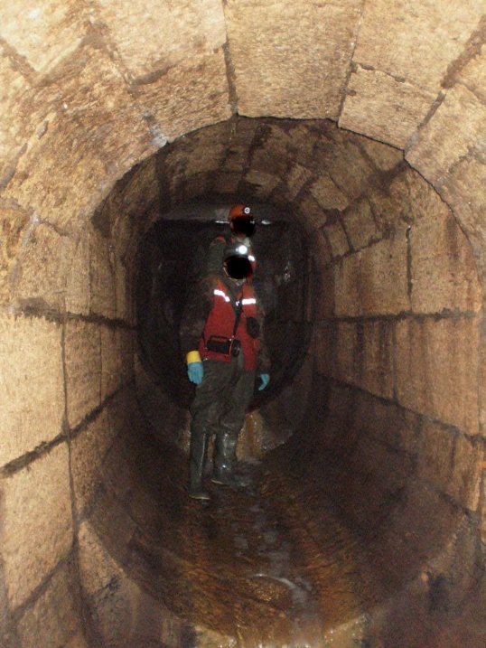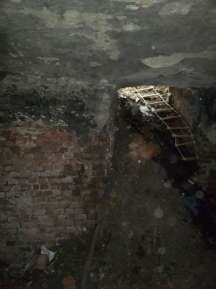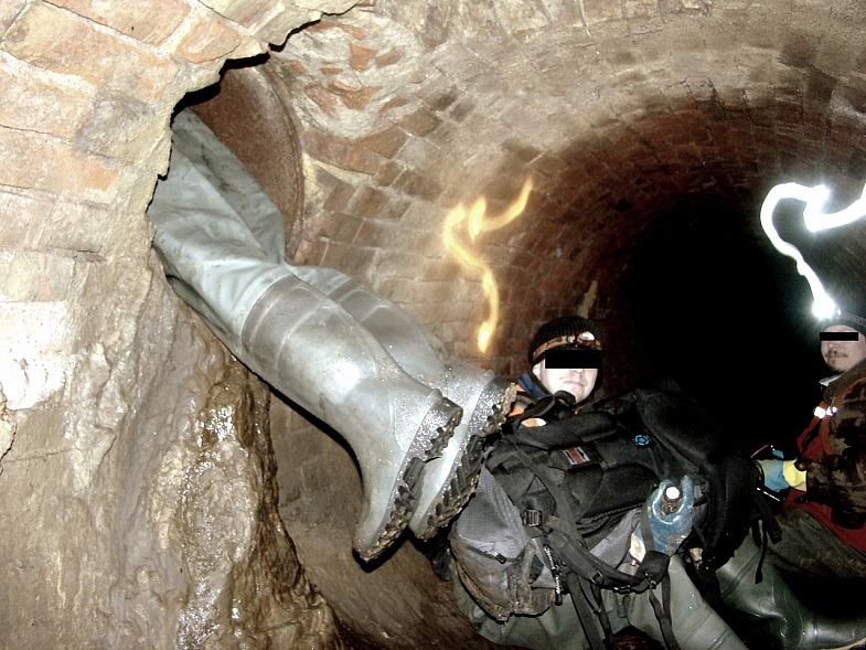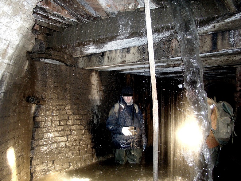 Да, им открылся старый кирпичный коллектор очень серьезных размеров, в ширину метра два с половиной и в высоту сводчатого потолка все три. Пол был кирпичный с остатками старых истлевших досок и мелких ломаных кирпичей. С одной стороны, ход под прямым углом поворачивал резко направо с другой шел прямо вдаль, свет фонаря не добивал до конца. Троица пошла к повороту, за ним ход шел еще на метров 10 после чего к великому сожалению исследователей заканчивался завалом из камней, бревен, и прочей дряни. Выйдя в длинную часть, двинулись по ней. Проходя по этому тоннелю, ребята видели по обе его стороны еще несколько забутовок из кирпича. Одну из них было решено вскрыть. Бесполезно. Кирпич был старый, и заложены проходы были очень давно, не в один слой. Ни кирка, ни лом кладку не брали, пробив 3 слоя. Решено идти дальше. Пошли.