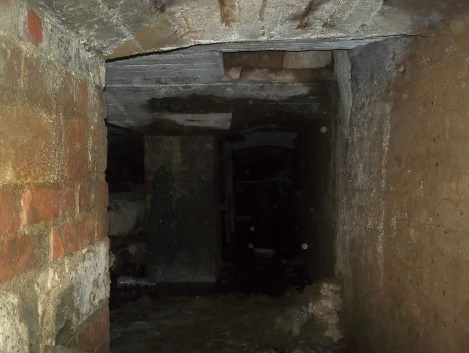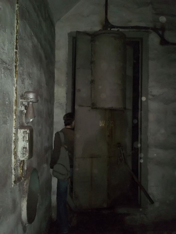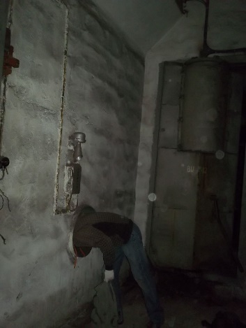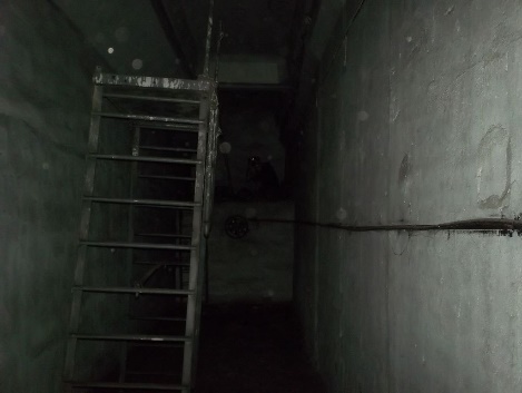 Редбулл поднялся по лестнице наверх, высота была метра три с лишним и сказал, что квадратный люк не открыть, он весь проржавевший. (Надо сказать, что спустя некоторое время, ребята вернутся сюда снова и все – таки вскроют этот люк – но это уже другая история…) Тогда направились к очередному коридору. Он был намного длиннее первого и также начал плавно изгибаться в сторону. Вот ответвление налево и ступеньки наверх. Посмотрим куда ведут? Метров пять по ступенькам наверх. Деревянная дверь. Попробуем на прочность. Шатается. Судя по замочной скважине закрыта на ключ. Что же за ней?!