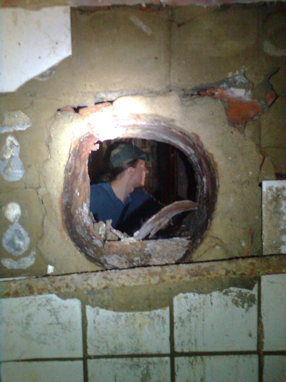 Не стоит забывать, что этот залаз был для ребят первым и абсолютно неожиданным. Все трое были под огромным впечатлением, а Лева уже чуть ли не истерил. Решено было вылезти через близлежащую шахту, откуда пробивался дневной свет. Редбулл поднялся по лестнице, верх шахты венчал прямоугольный лючок. Лючок оказался полностью открытым. Ребята оказались в каменном мешке с дверью. Дверь была старой, но закрытой довольно надежно. Однако не намертво. После нескольких усилий и толчков дверь стала ходить вперед-назад с той стороны, где она открывалась, и ребята увидели, что она закрыта мотком проволоки. После определенных усилий проволока была изнутри размотана и в лицо ребятам ударил дневной свет… А дальше был пожалуй шок…