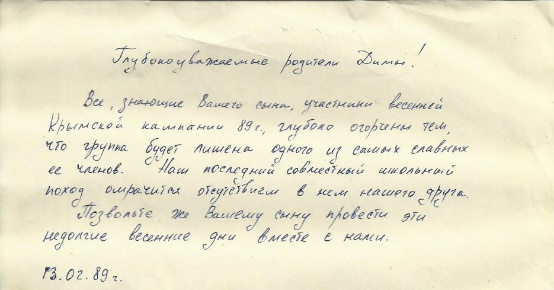 С сентября по март вся школа готовилась к ежегодным весенним крымским походам. Но, чтобы попасть в заветный список участников и увидеть весеннее Чёрное море где-нибудь в районе Ялты, цветущие рододендроны, снежные шапки вершин старых гор, вдохнуть свежий ветер, да и просто провести неделю в компании друзей, предстояло пройти определённое количество километров по подмосковным тропам. Ходили мы пешком и на лыжах. С ночёвками и в однодневные походы. И вот, нужные километры в копилке, поведение в норме, а вот прилежание… Да и не только само по себе прилежание, но и грядущее поступление в институт. Посещение репетиторов и библиотек. Ведь, по мнению всех моих дорогих и любимых родственников, непоступление в институт было сродни самому ужасному ужасу, который только можно было представить. Долгие переговоры на кухне не приводили к желаемому для меня результату. Заверения в уверенности в своих силах и знаниях не принимались. Мои родители наложили «вето» на мой последний в школьной жизни майский поход. Прознав об этом, мои дорогие одноклассники написали письмо родителям.