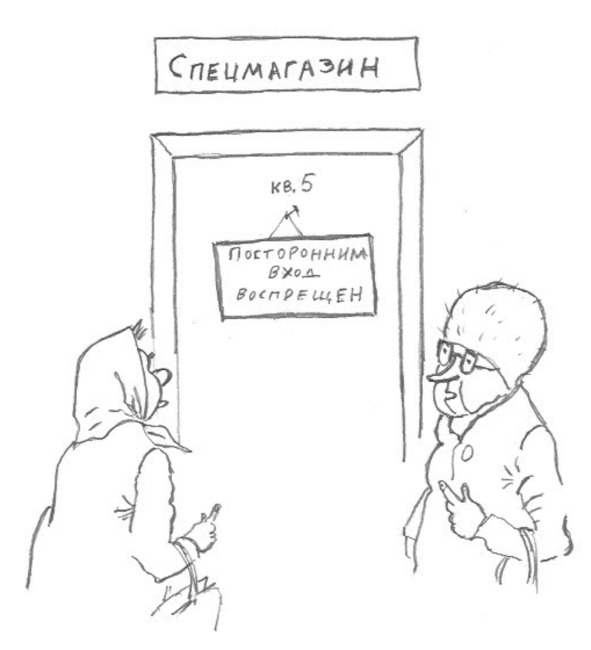 Спецмагазин строителей располагался на первом этаже пя-тиэтажки в однокомнатной квартире. Из кухни я сделал склад. Построил там стеллажи из половой доски до самого потолка. В самой комнате соорудил нечто похожее на прилавок. Он делил комнату пополам. За прилавком стояла продавщица. Перед прилавком толкались приехавшие с трассы и имевшие разнарядку от начальства на приобретение товаров и другие блатные из местных. Посторонних в магазин не пускали. Объявлений с режимом работы на нем не было.