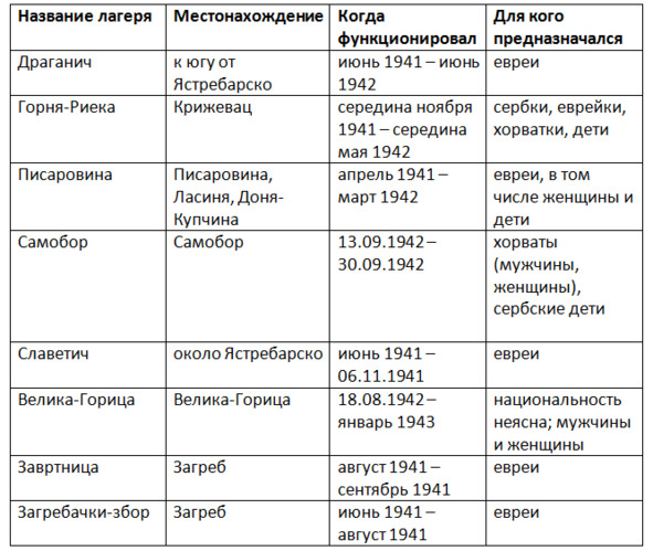 Что касается разделения по национальному признаку, провести более или менее четкие границы не представляется возможным. Большинство (иногда – абсолютное) лагерного «контингента» почти везде составляли сербы; в существенно меньших, но тоже заметных количествах присутствовали евреи; и, вероятно, во всех относительно крупных и долго существовавших лагерях было некоторое количество хорватов, бошняков, цыган и представителей других национальностей.