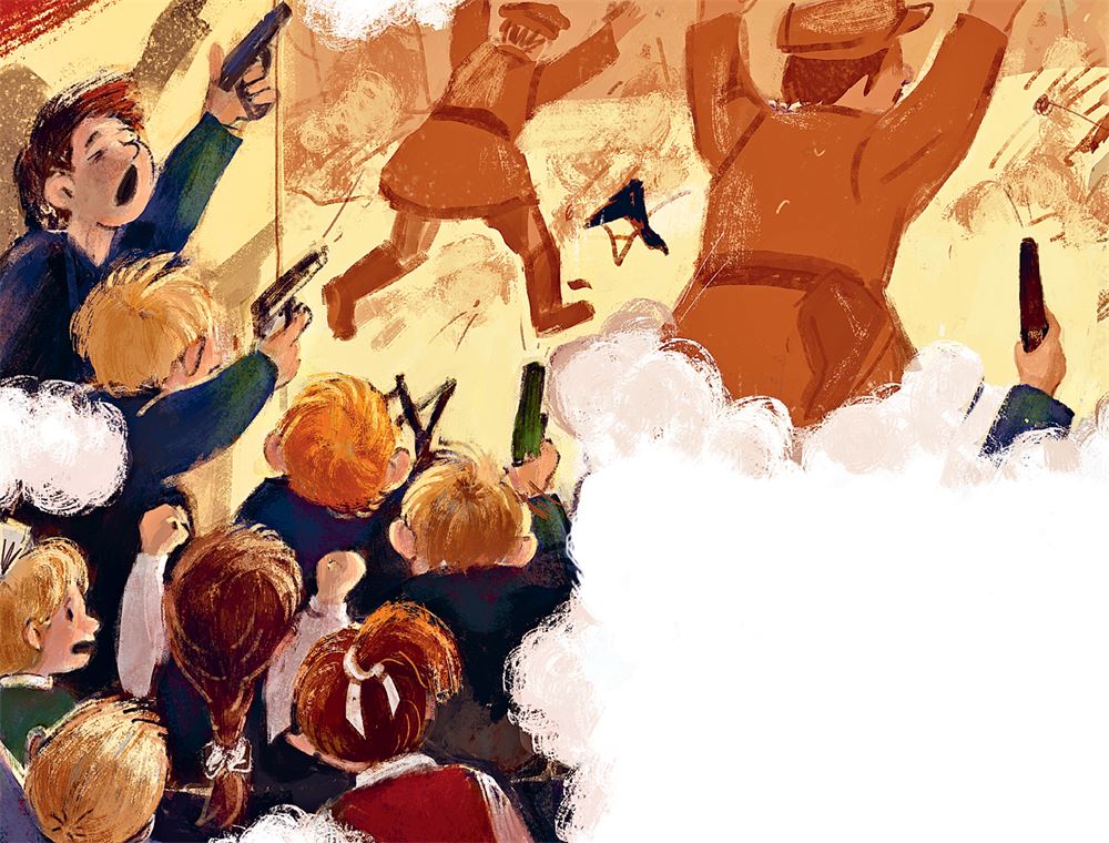 И мы стали палить изо всех пистолетов сразу. Мы хотели во что бы то ни стало помочь красным. Я всё время палил в одного толстого фашиста, он всё бежал впереди, весь в чёрных крестах и разных эполетах; я истратил на него, наверно, сто патронов, но он даже не посмотрел в мою сторону.