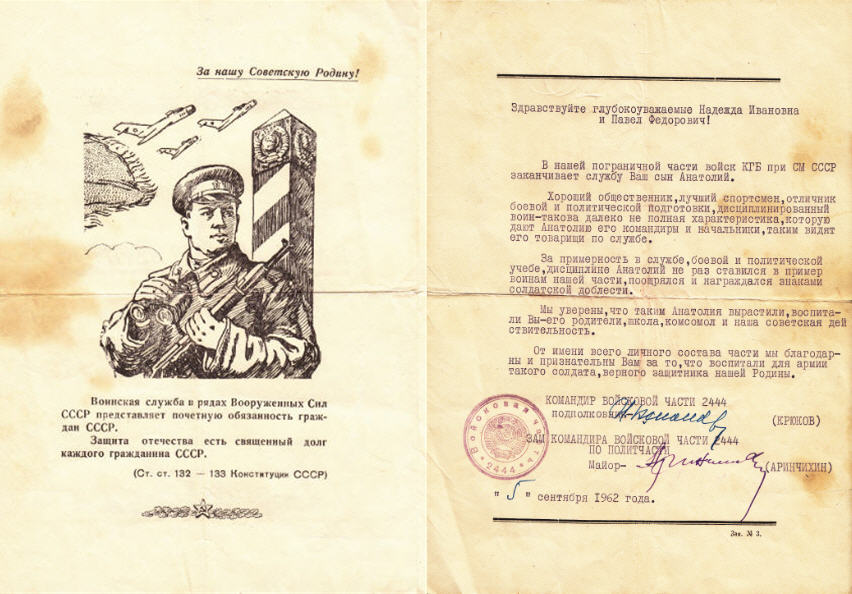 Полтавка, на которой служил знаменитый пограничник Н.Ф. Карацупа. В течение двух недель командиры наблюдали, что бы выявить тех, кого направить в школу сержантского состава. В это время произошёл прорыв группой нарушителей через нашу границу. Трое суток наша тревожная группа колесила по Уссурийской тайге. Было трудно, без отдыха и в постоянном напряжении, да ещё на спине радиостанция Р-109, весом 8 кг. Задержала нарушителей другая пограничная группа.