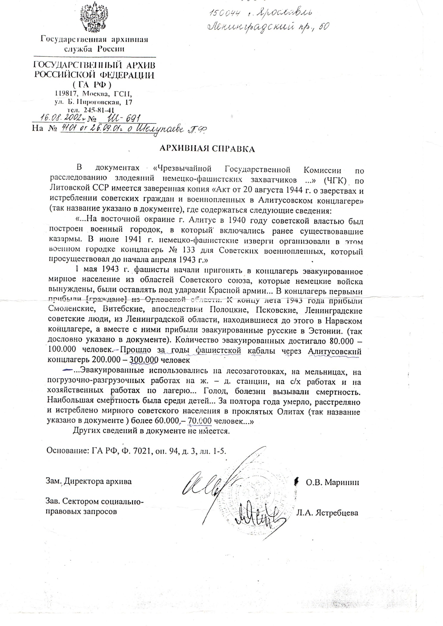 В июле 1943 года, после разгрома на Курской дуге, немцы начали отступать. Почти всех жителей села повыгоняли из их домов, в том числе и нашу семью. Построили в большую колонну и погнали на железнодорожную станцию. Собрав народ, загнали в товарные вагоны и повезли. Как оказалось, в концлагерь «Алитус», находящийся на границе Литвы с Германией. Он представлял собой строения военных казарм на окраине города Алитус. Еще в июле 1941 года немцы организовали здесь концлагерь №133, который они использовали для военнопленных до апреля 1943 года, а затем приступили поставлять в него эвакуированное мирное население с оккупированных ими территорий.