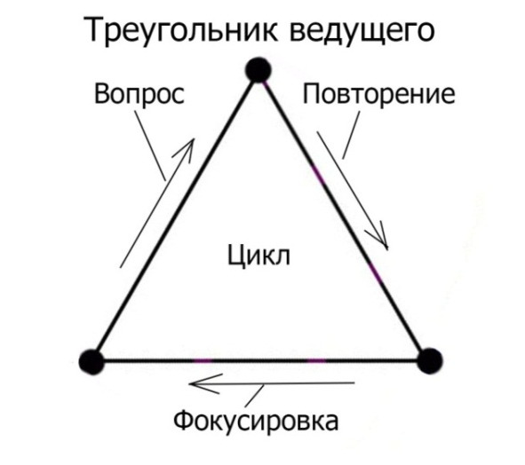 Ведущий в этом процессе тоже осуществляет свой алгоритм или цикл: повторение – фокусировка – вопрос (ПФВ). После начальной процедуры определения расположения в пространстве помещения и первого заданного вопроса, он в основном выполняет этот алгоритм, который можно выразить в виде фигуры треугольника (см. рис. 5).