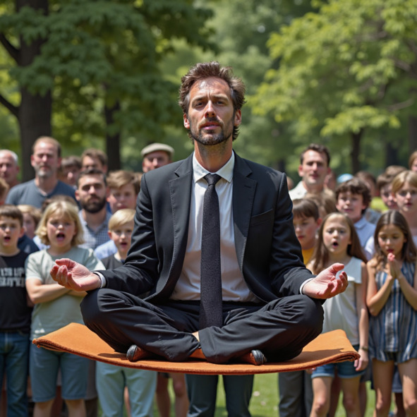 Около минуты стояла абсолютная тишина, только где-то недалеко весело пела птичка. Видимо на неё этот полёт не произвёл такого сильного впечатления. Спустившийся с небес мужчина лет сорока был в аккуратном костюме и галстуке. Он ловко свернул коврик в трубочку, подошёл к ожидавшим его людям и спокойно сказал: