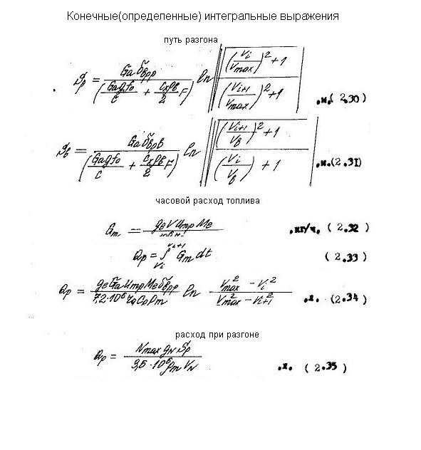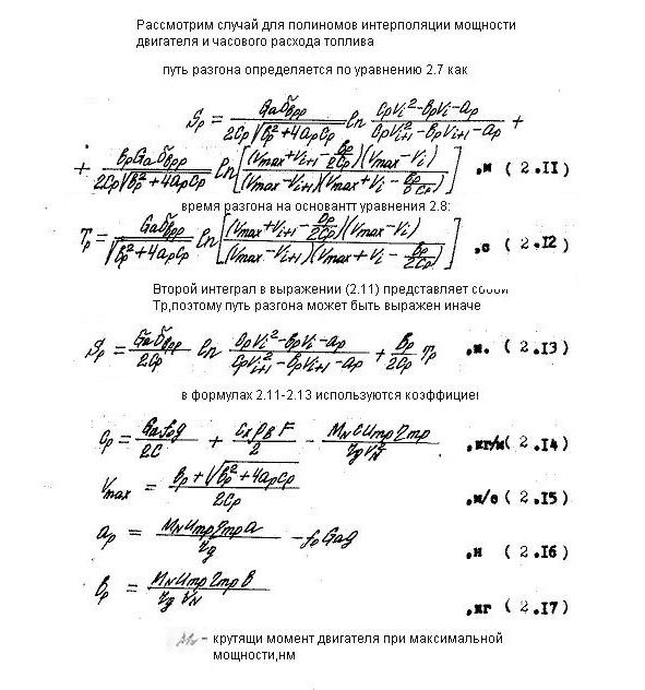 2.5.Интегральный вид уравнения движенияи определение параметров движения.2.5.1.Общий случай интегрирования.Рассмотрим случай для полиномной интерполяции мощности двигателя и часового расхода топлива.Путь разгона определяется на основании уравнения (2.7)как (2.11), а время разгона на основании уравнения (2.8)как (2.12).Второй интеграл выражения (2.11) представляет собой время разгона, поэтому путь разгона также может быть выражен иначе: (2.13)В формулах (2.11—2.13) используются следующие расчетные коэффициенты (2.14) – (2.17):Ме – крутящий момент двигателя при максимальной мощности, нм,VN – скорость автомобиля, соответствующая макси-мальной мощности, м/с,а,в,с – коэффициент полинома (2.18)We» – удельная угловая скорость,We – текущая угловая скорость коленвала двигателя, с-1,WN – угловая скорость при максимальной мощности, с-1,Vi, Vi+1 – начальная и конечная скорости разгона, м/с,Выражение (2.12) для определения времени разгона в диапазоне от Vi до Vi+1 может быть записано также в следующем виде (2.19)где delta – дискриминант.При значениях характерных для случая многих двухтактных двигателей, -интеграл в уравнении (2.8) будет вида: (2.20).Как показывают расчеты выражения (2.12) и (2.20) дают абсолютно идеинтичные результаты. Данный метод интегрирования для основных показателей основан на полиномной интерполяции характеристик двигателей, что сразу дает в аналитическом виде значение решения. Значения коэффициентов полиномов приведены в таблице 2.3,а формы кривых полиномов на рис.2.3.а-в. Значения коэффициентов полиномов можно определить известными методами.