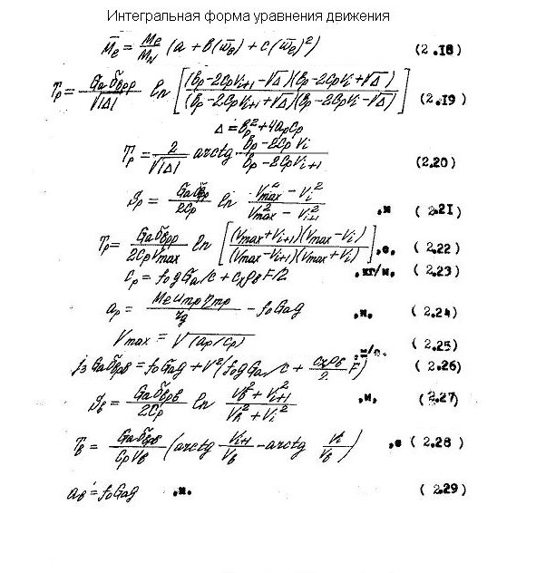 Кроме того, существует частный случай интегрального вида уравнения движения. Он получается в идеальном случае, если момент двигателя постоянен: случай линеаризации. Иногда линеаризация может оказаться более выигрышной. При этом коэффициенты в уравнении движения (2.3) будут иметь несколько иной вид, а интегральное выражение для определения величины пути можно записать как, м (2.21),а время разгона (2.22). В этом же случае можно записать развернутое уравнение выбега, полученное из уравнения (2.26).Интегрируя его аналогично (2.7) определяем путь выбега (2.27),а время выбега определяется как (2.26),