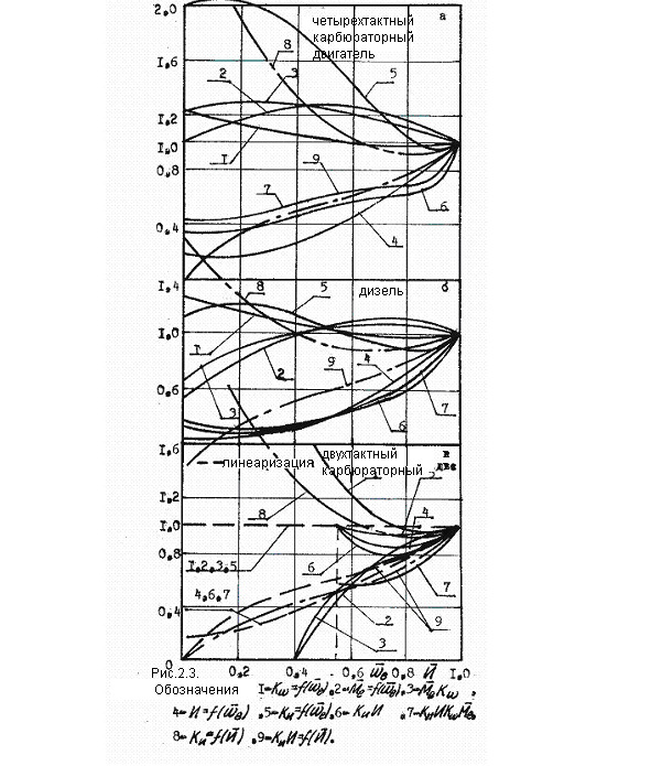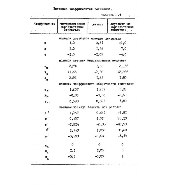 Данный случай является упрощенной идеальной моделью. Для полиномных моделей коэффициентов Коб и Ки уравнения часового расхода топлива (2.32) пропорционально произведению скорости на коэффициенты полиномов Коб, Ме, Ки, являющиеся полиномами удельной частоты вращения, следовательно зависит от 5-й степени скорости автомобиля: (2.36), (2.37).Коэффициенты полиномов для разных типов двигателей могут быть рассчитаны аналитически, их значения представлены в таблице2.3. Однако, тогда уравнение расхода топлива (2.33) при интегрировании дает значение, пропорциональное 6-й степени скорости, что приводит к усложнению непосредственно интегрирования и уменьшения точности расчетов за счет разложения интеграла в ряд и т. п. Кроме того, необходимо отметить, что реальные характеристики двигателя, например, Ме не всегда могут быть описаны полиномами второй степени точно – для этого требуются полиномы 3-5-й степени.