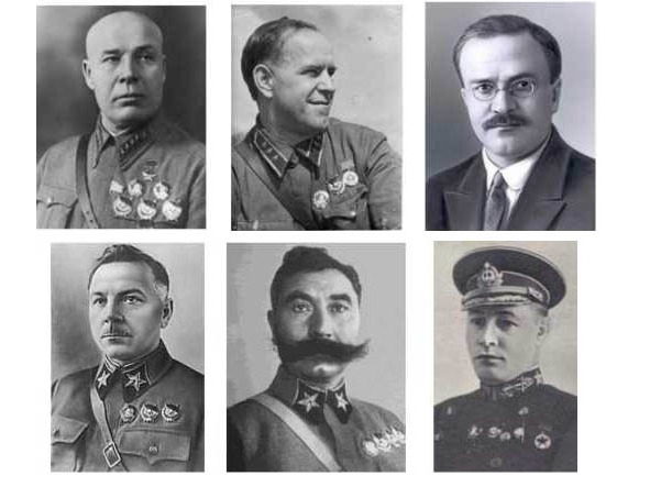 На снимках (слева-направо) члены Ставки ВГК: С. Тимошенко, Г. Жуков, В. Молотов, К. Ворошилов, С. Буденный, Н. Кузнецов. https://yandex.ru/images/search