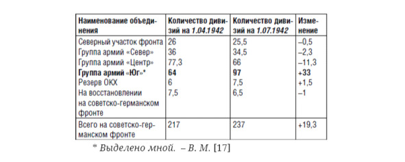 Из таблицы видно, что за период с апреля по июль 1942 года количество действовавших на советско-германском фронте вражеских дивизий возросло на 19 соединений. За это же время состав группы армий «Центр» сократился более чем на 11 дивизий, а группы армий «Юг» увеличился на 33 дивизии. Последнее было достигнуто за счет переброски на южное крыло фронта новых соединений с Запада, а также с других участков советско-германского фронта, в том числе 7 дивизий и управления 4-й танковой армии из группы армий «Центр».