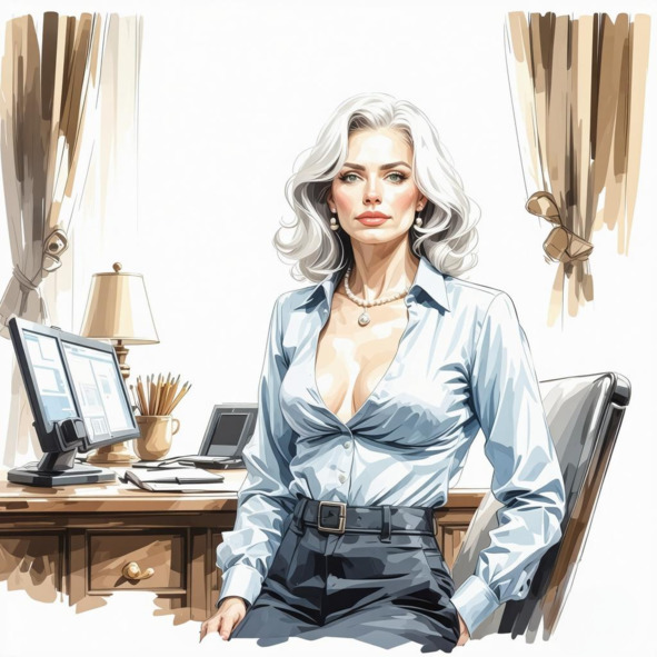 За столом сидит высокая женщина лет, так за сорок, очень красивая. Ее внешность привлекала внимание мужчин сразу. Это была дама, которая может привлечь к себе внимание мужчин из всех слоев общества. Она удобно расположилась в дорогом кресле, ее руки лежали на подлокотниках, ее спина красиво оттолкнулась от спинки кресла. Светло-синяя блузка с немного открытым декольте, из которого виднелся темный лифчик, выдавала очень упругую грудь немалого размера. Дама встала с кресла, опершись руками на стол. Она надела сегодня темно-синюю юбку-карандаш, что так красиво обрисовывала ее бедра. Когда она шла на каблуках в десять сантиметров, она очень привлекала внимание к себе не только мужчин, но и женщин. Она пошла в сторону желанного гостя, который всегда радовал ее. Девушка, выйдя из-за стола, раскачивая своими бедрами, радостно подошла к писателю. Она, обняв его и поцеловав, держала его обеими руками за плечи и смотрела на него прямым взглядом. Ее светлые волосы красиво отсвечивали от окна и ламп, которые уже освещали их вечернюю встречу. Ее жемчуг на шее величественно придавал ей статус высокопоставленного человека. Жемчуг идеально подходил к ее улыбке и белоснежным зубам. Ее красивые губы: верхняя чуть меньше нижней, а нижняя довольно пышная и привлекательная, – красиво подчеркнуты блеском помады, придавая объем ее губам. Глаза у дамы были темно-зеленого цвета, с густыми ресницами и густым бровями.