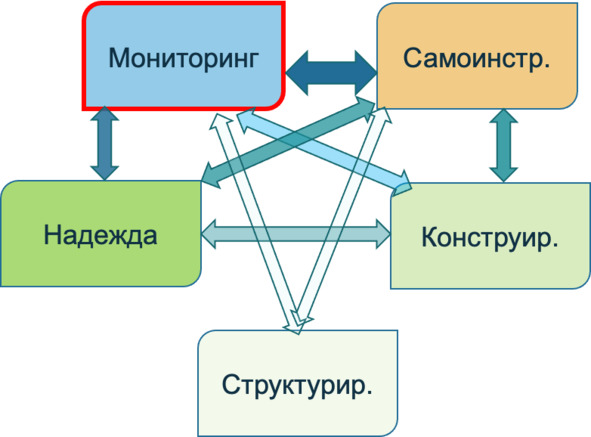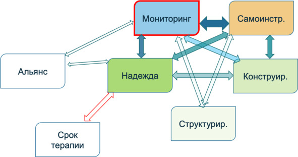 2. «Мониторинг» связан с «Надеждой». Если с помощью наблюдения и обсуждения достижений (мониторинга) видится прогресс и эффект от всей терапии, то и надежда на благополучное течение и завершение терапии становится выше (положительное подкрепление).